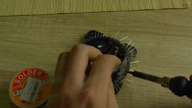 Фиксируем плату в приспособлении для пайки "третья рука" и наносим на ножки флюс, далее паяем при помощи паяльника и припоя необходимые контакты с выводами.