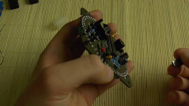 Далее устанавливаем транзистор, он имеет полукруглую форму, на плате как раз под его установку сделан такой же полукруг, после этого ставим на место кварц, полярности у него нет.
