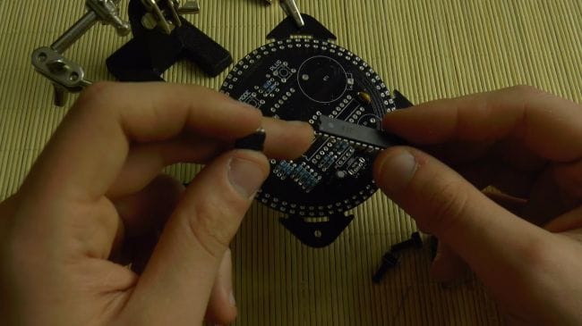 Теперь нужно расположить микросхемы в правильном направлении. Для того, чтобы схема заработала устанавливаем микросхемы таким образом, чтобы ключ на ней в виде полукруглой выемки совпадал с ключом на плате.