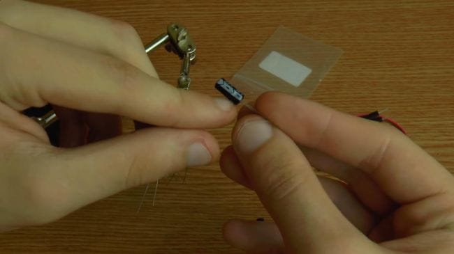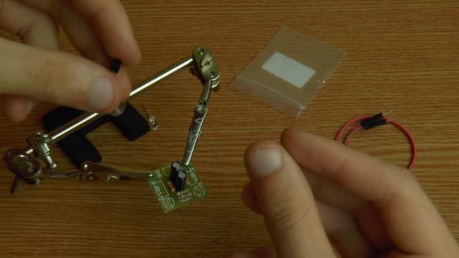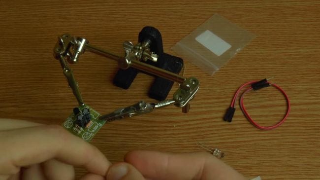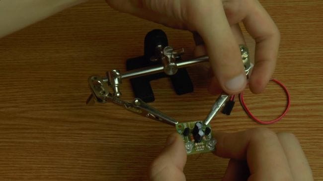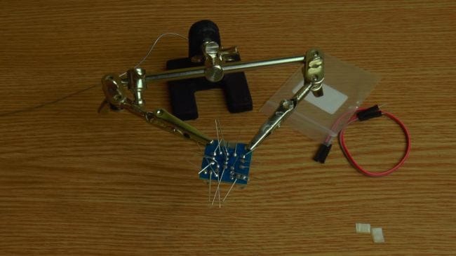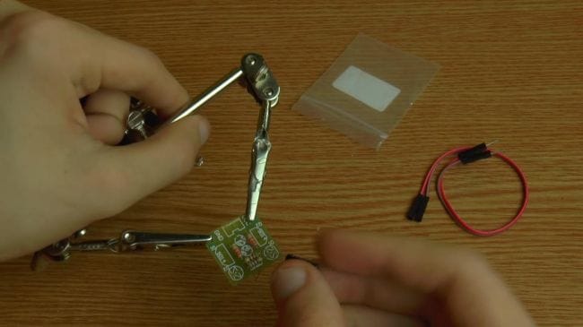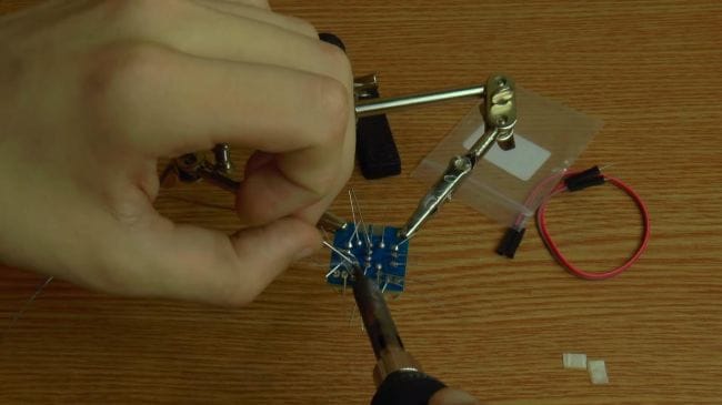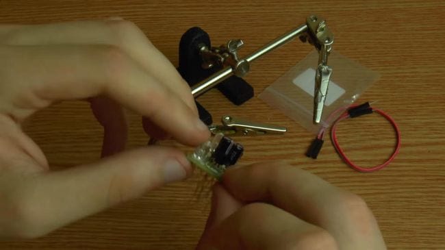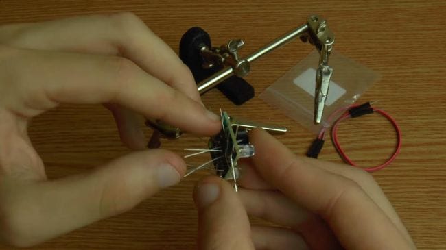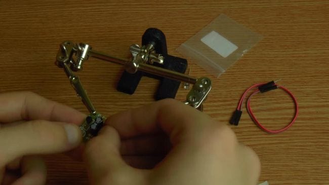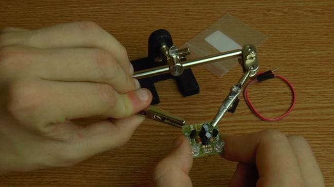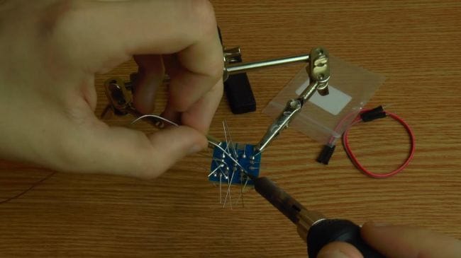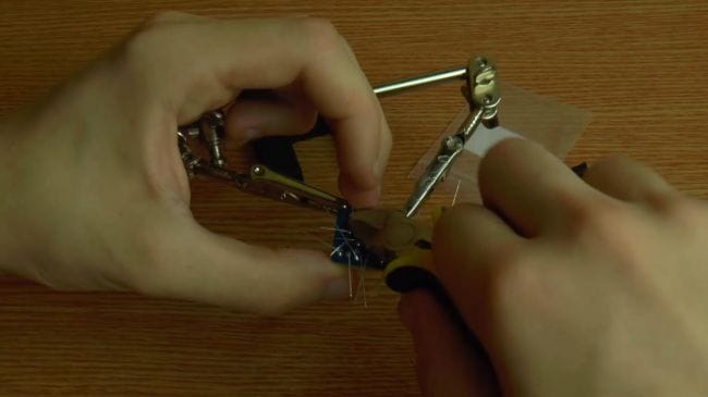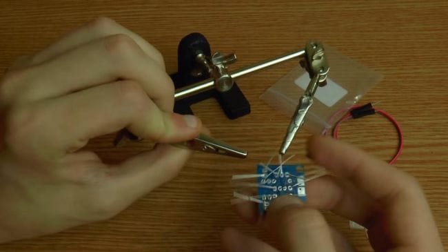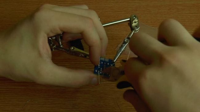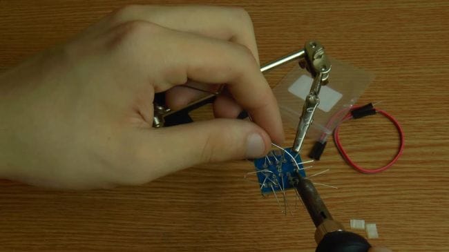Далее зажимаем плату в приспособлении для пайки "третья рука" и наносим флюс. После того, как нанесли флюс на контакты, припаиваем при помощи паяльника выводы.