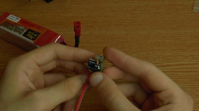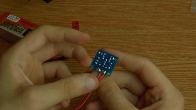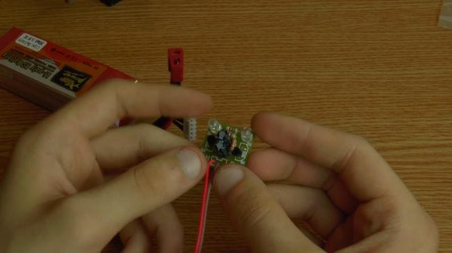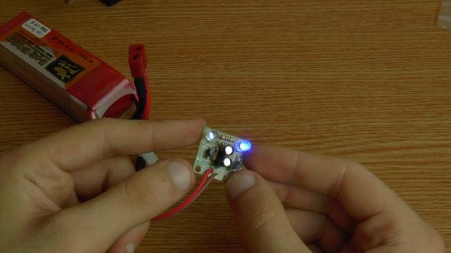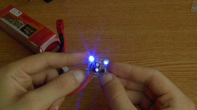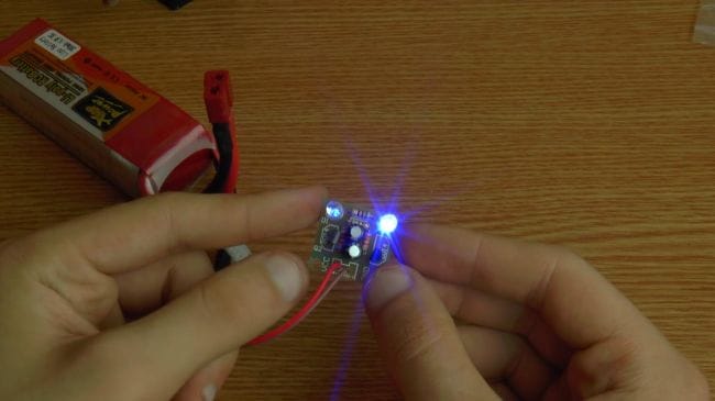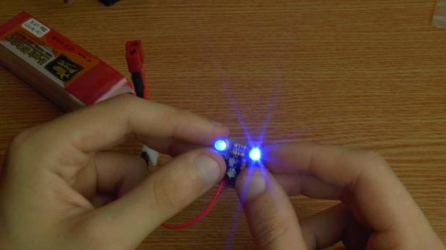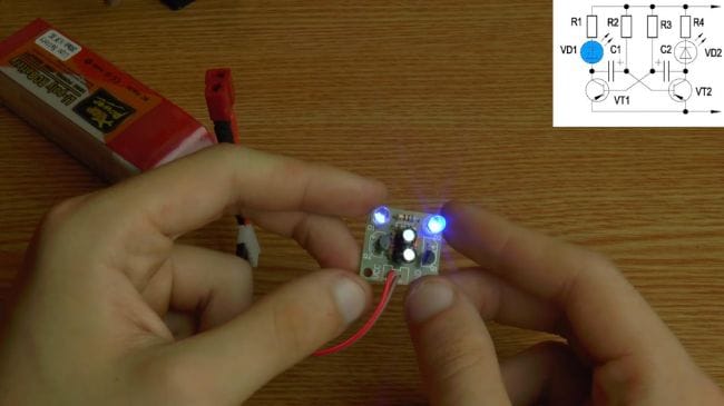 Пришло время проверить мультивибратор, подключаем аккумулятор с напряжением 3.7 вольт. Как видно, схема заработала, светодиоды поочередно загораются.