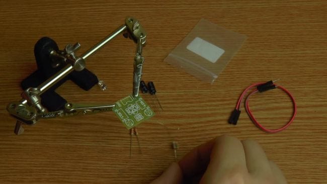 Фиксируем плату в приспособлении для пайки "третья рука" и устанавливаем резисторы согласно их номиналу.