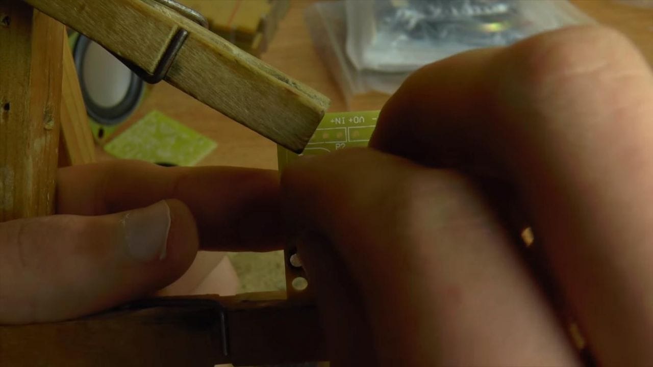 Для лучшего спаивания деталей наносим флюс и паяем выводы паяльником, подавая припой к месту контакта. Удаляем остатки выводов при помощи бокорезов.