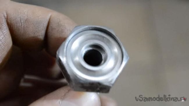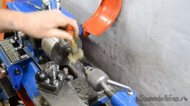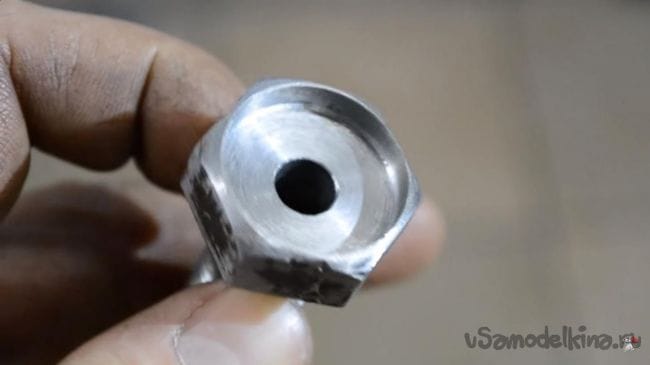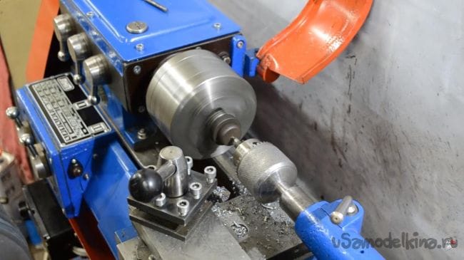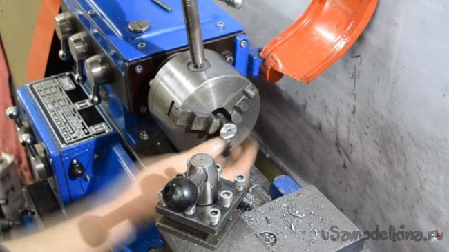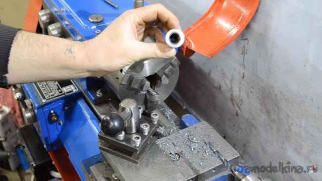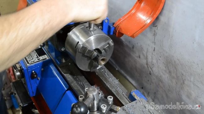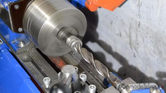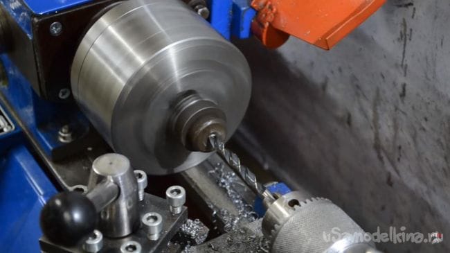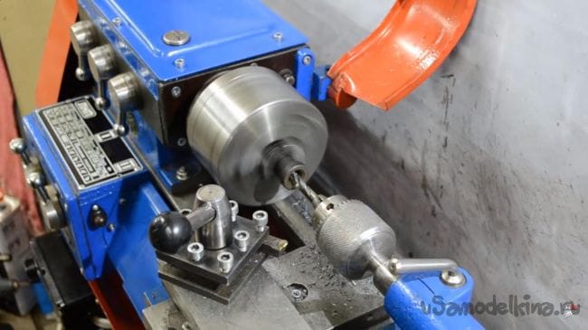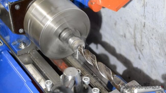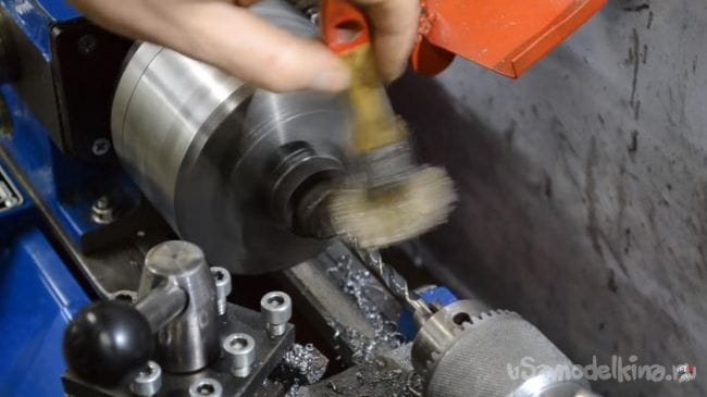 Далее зажимаем заготовку в трехкулачковый патрон токарного станка и сверлом по металлу с диаметром 8 мм делаем отверстие насквозь, периодически смазывая техническим маслом кончик сверла, так сверло будет дольше держать заточку, а значит и сама периодичность его затачивания уменьшиться.
