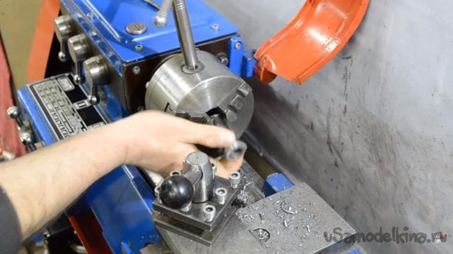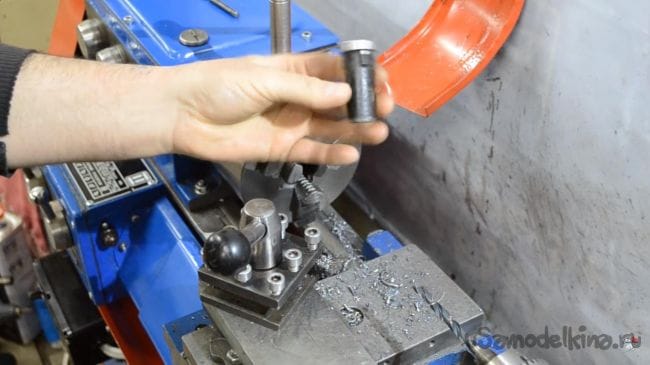 При сверлении также не забываем смачивать сверло маслом. Далее в резцедержку устанавливаем отрезной резец и обрезаем болт до длины 60 мм, подпирая его со стороны головки вращающимся центром, чтобы не было перекосов.