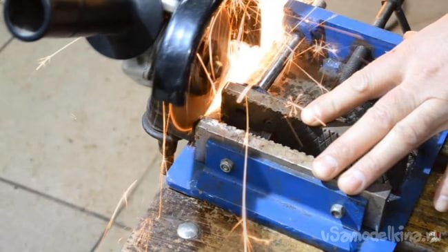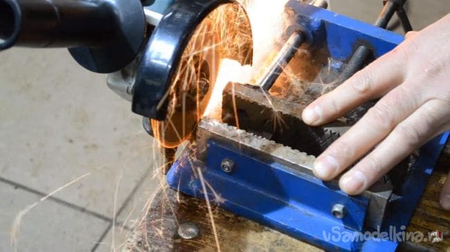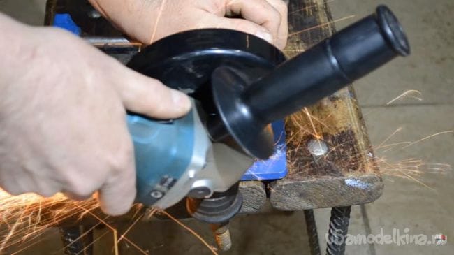 Зажимаем наконечник в слесарные тиски и при помощи УШМ с установленным в нее отрезным кругом, отпиливаем ненужную часть. При работе с углошлифовальной машинкой не забывайте о мерах безопасности, электроинструмент нужно держать уверенно, а работать с ним только в защитных очках и перчатках.