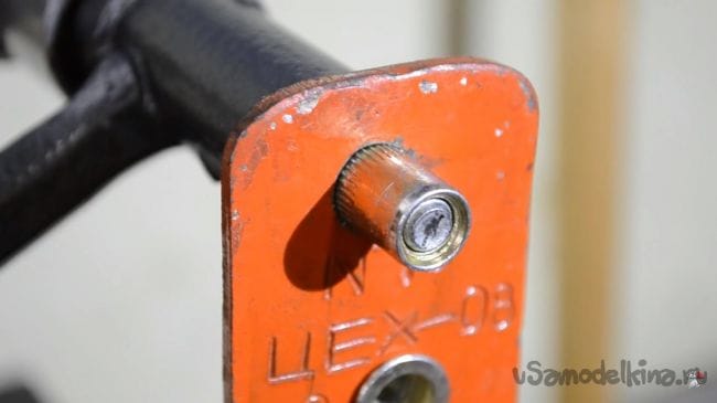 Данный инструмент предназначен для установки заклепок с резьбой в листе металла. Поэтому сверлим в листе металла отверстия под установку заклепки. Устанавливаем болт с опорным подшипником в наш самодельный заклепочник, часть которого уже находится в шляпке болта большего размера и накручиваем заклепку на резьбу до упора вручную.