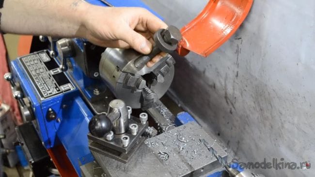 На токарном станке дорабатываем болт ступицы, зажимаем в трехкулачковый патрон и делаем небольшое отверстие центровочным сверлом для большей точности, после чего устанавливаем сверло по металлу диаметром 8 мм и углубляемся в тело болта на глубину 60-70 мм.