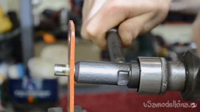 Заклепка надежно сидит в отверстии и не люфтит, а также не прокручивается, что нам и нужно. Так выглядит процесс заклепывания более крупным планом, главное при заклепывании не перекашивать заклепку, иначе она может просто не закрепиться.