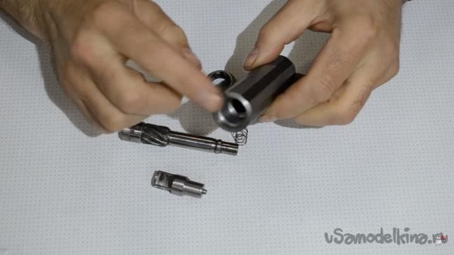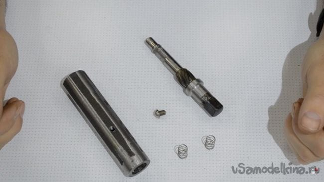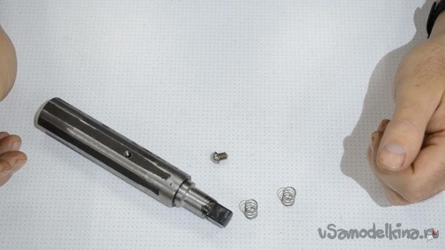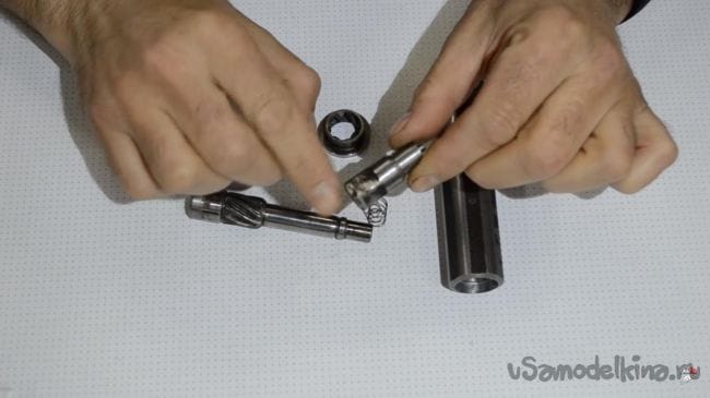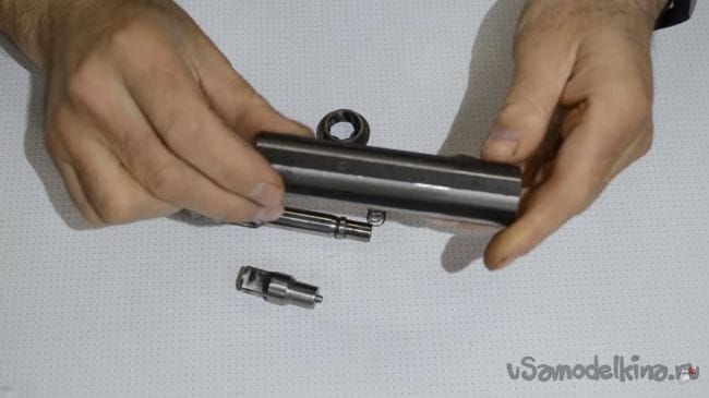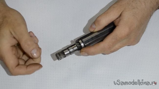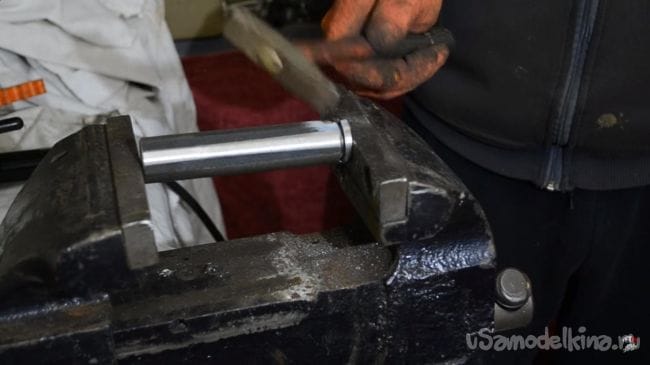 Из самого якоря нужно извлечь шток, сделать это можно при помощи пресса или же мощных слесарных тисков. Также якорь можно выбить и ударами молотка, но в таком случае есть риск его деформировать, поэтому такой способ не советую. Итак, зажимаем якорь в тисках и выдавливаем шток, после того, как он полностью вышел, переходим к следующему шагу.