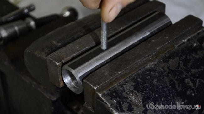 Далее зажимаем деталь в тиски на верстаке и при помощи метчика нарезаем резьбу под болт М6, в процессе нарезки резьбы добавляем специальную смазку, которая уменьшить износ метчика.