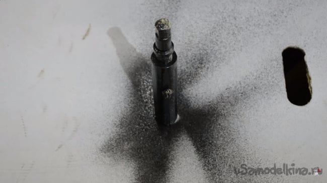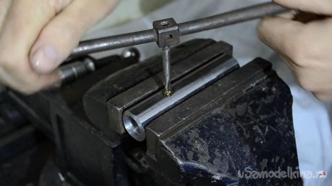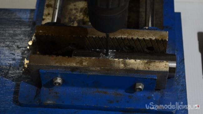Для фиксации штока зажимаем основание в тисках и при помощи сверлильного станка просверливаем отверстие диаметром 5 мм под болт.