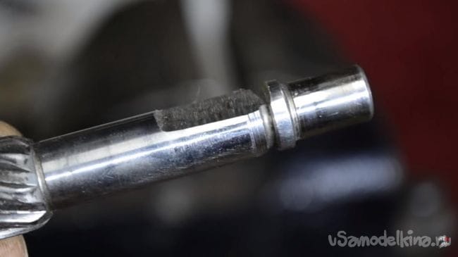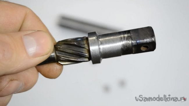 Теперь от бендикса нужна часть со шлицами, ее можно отпилить при помощи углошлифовальной машинки с установленным отрезным диском, а затем доработать на токарном станке до нужного размера. При работе с углошлифовальной машинкой будьте аккуратны, электроинструмент надо крепко держать в руках, а также не забывать о защитных очках и перчатках. Шлицевая часть в дальнейшем будет одеваться на вал и от удара передавать ему вращение.
