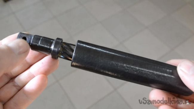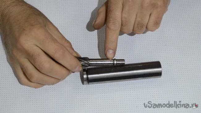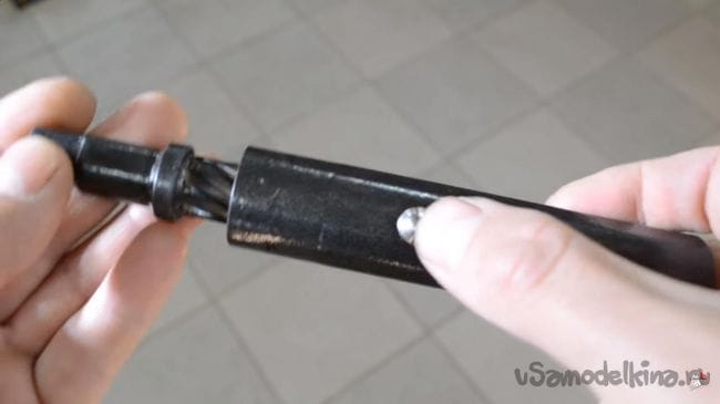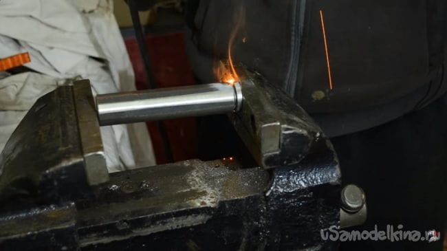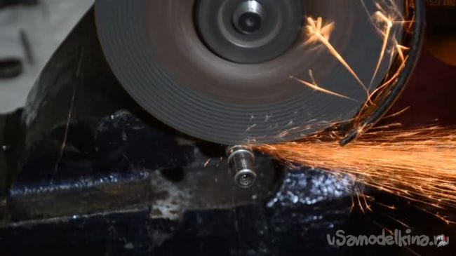 На самом штоке нужно сделать фрезеровку, так как фрезерного станка нет, затягиваем деталь в тисках и при помощи углошлифовальной машинки делаем небольшой паз, который не даст штоку свободно выпасть.
