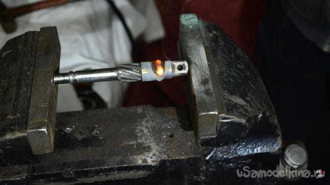 Пришло время сварочных работ. Устанавливаем шлицевую часть в основание и фиксируем в тисках, далее при помощи сварочного аппарата свариваем детали вместе. При работе со сварочным аппаратом используйте средства индивидуальной защиты, сварочную маску и краги.
