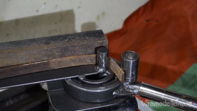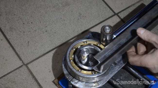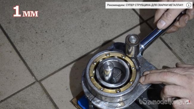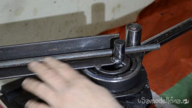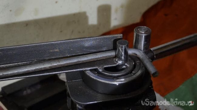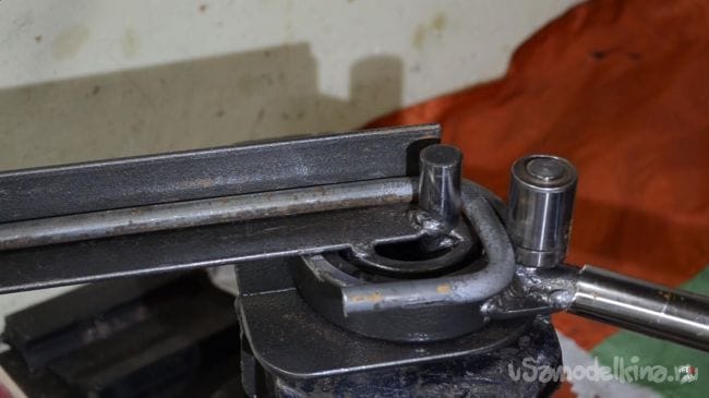 Далее устанавливаем в направляющую металлический пруток диаметром 12 мм, а затем поворачиваем ручку подвижной части, в процессе чего пруток начинает гнуться.