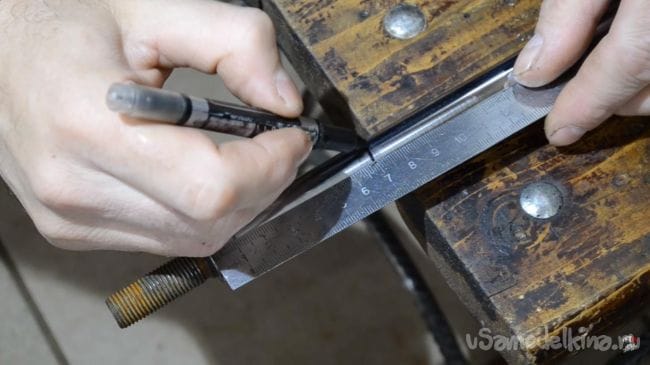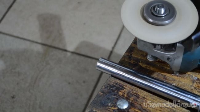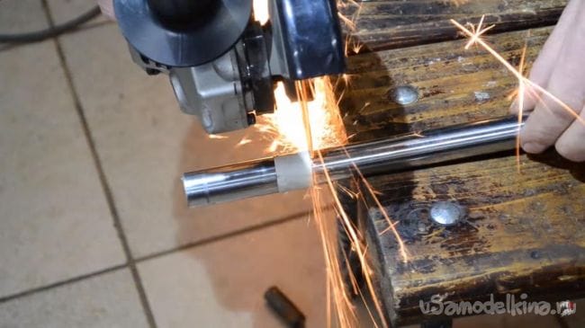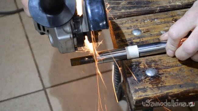 Теперь берем в руки углошлифовальную машинку с установленным в нее отрезным кругом и отрезаем резьбовую часть от штока, а затем необходимую часть по разметке, сделанной ранее. При работе с углошилфовальной машинкой будьте аккуратны, при резе держать инструмент нужно крепко, а также не забывать использовать средства индивидуальной защиты, такие как, наушники, перчатки и защитные очки.