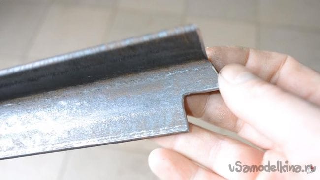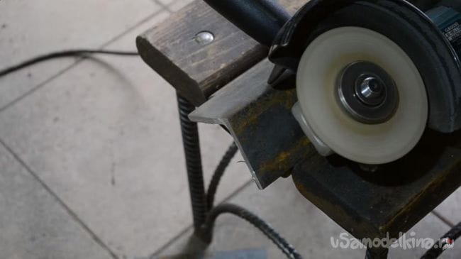 Закругленные края сделаны для придания инструменту красивого вида, а также для уменьшения травмоопасности при работе на нем. Отпиливаем при помощи УШМ 40-вой уголок, его длина должна быть 250 мм, по краям делаем такие же закругления, как и с предыдущим уголком, а в самой конструкции выпиливаем небольшой квадрат на конце.