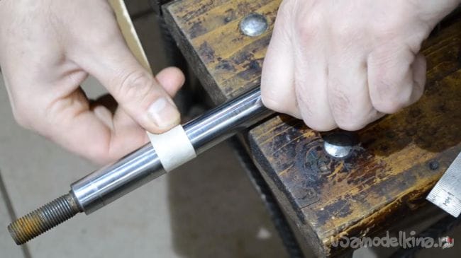 Первым делом от основания штока амортизатора отмеряем 70 мм, для большей точности делаем разметку малярным скотчем.
