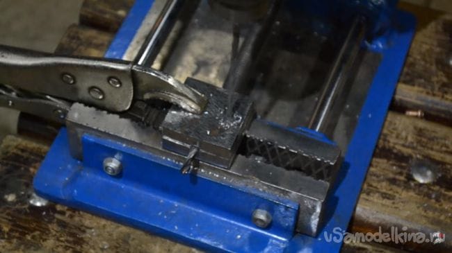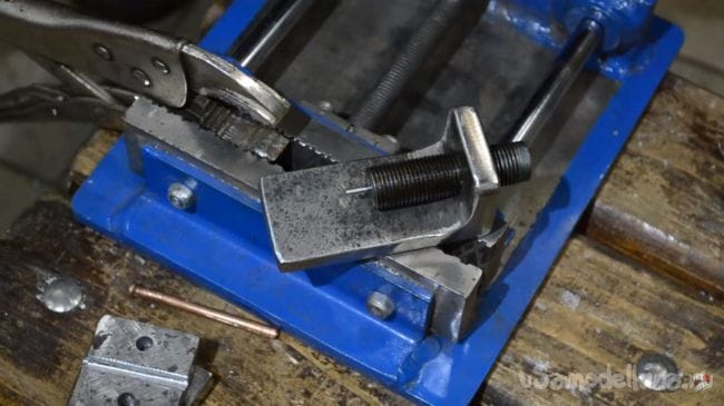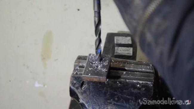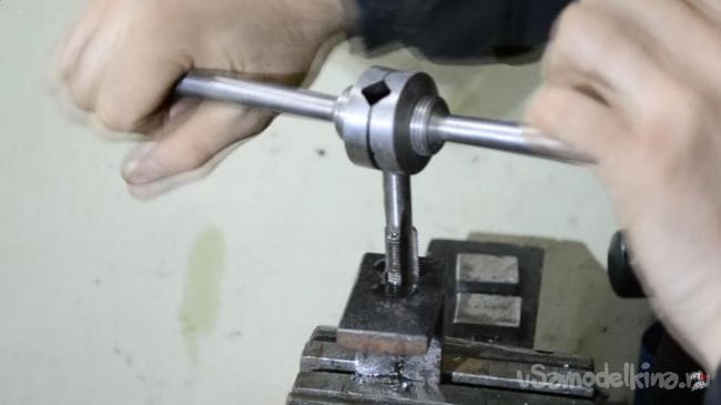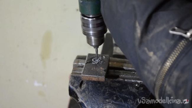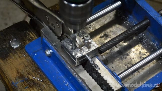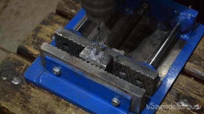 После этого разжимаем ручные тиски и просверливаем отверстия до конца сверлом диаметр которого 5 мм, а затем в этих отверстиях нарезаем резьбу М6 при помощи метчика.