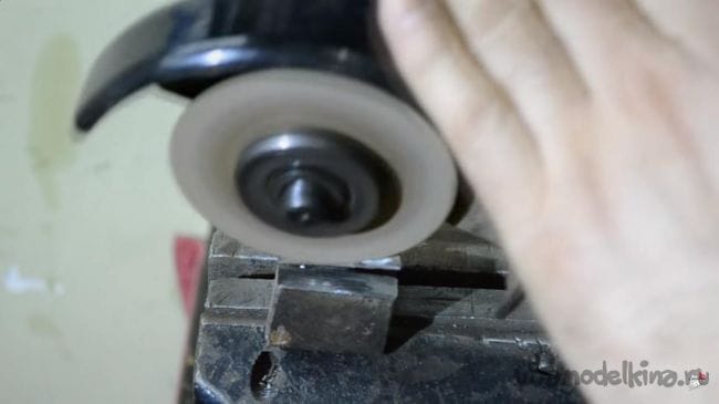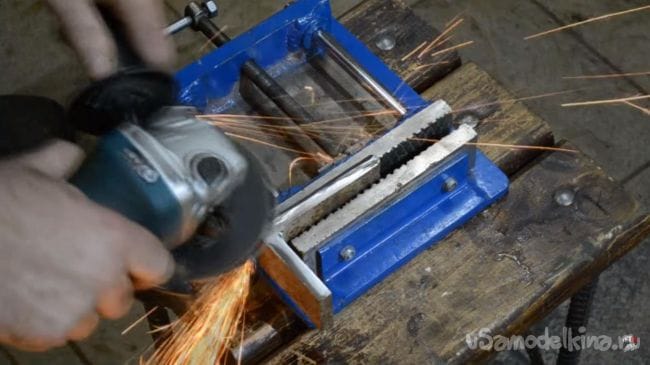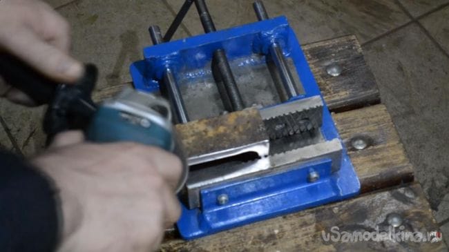 Далее фиксируем уголок в тисках и выравниваем торцы при помощи УШМ с установленным наждачным кругом для шлифовки, также немного скругляем края, чтобы не пораниться при работе с инструментом.