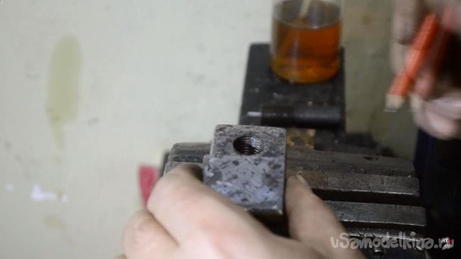 В процессе сверления не забываем добавлять техническое масло, так как это уменьшит степень износа режущей кромки сверла, что продлит срок его службы. В готовом отверстии нарезаем резьбу при помощи метчика, резьба в данном случае подбирается в зависимости от диаметра болта, здесь используется болт М12 от ступицы автомобиля. При нарезке резьбы также важно добавлять смазку.