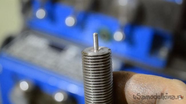Чтобы можно было вальцевать трубки, нужно сделать обработку ступичного болта. Для этого сначала укорачиваем его при помощи углошлифовальной машинки, а затем зажимаем болт в трехкулачковом патроне токарного станка по металлу и делаем проточку до диаметра 2,5 мм, к слову он равен внутреннему диаметру медной трубки.