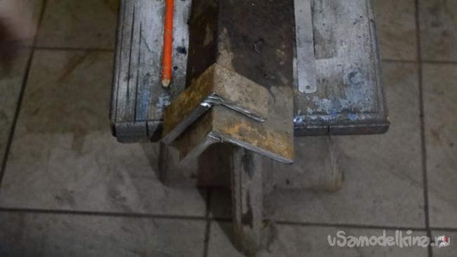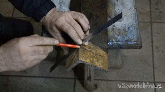 Зажимает металлический уголок размером 100 мм в тисках и при помощи линейки и карандаша делаем разметку, по которой нужно будет отпилить заготовку.