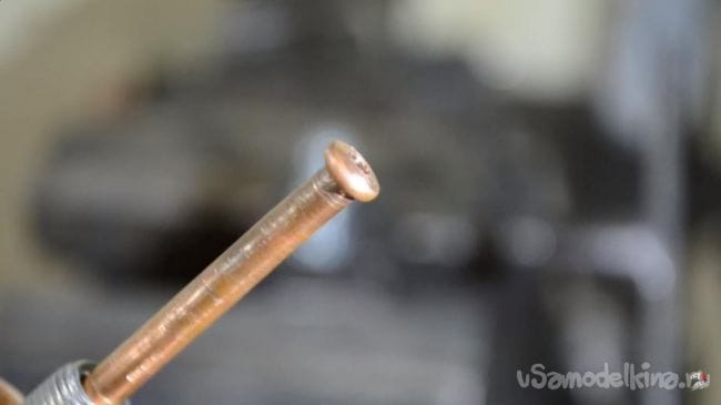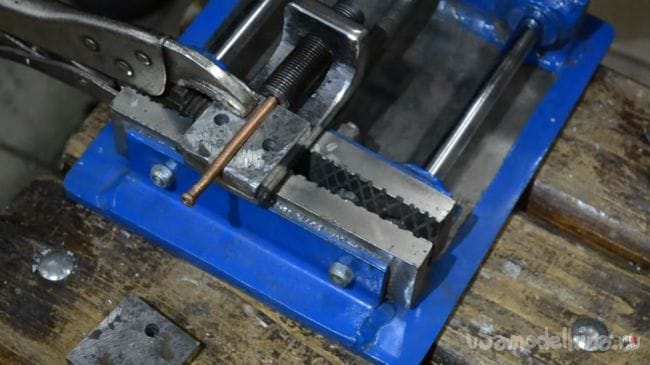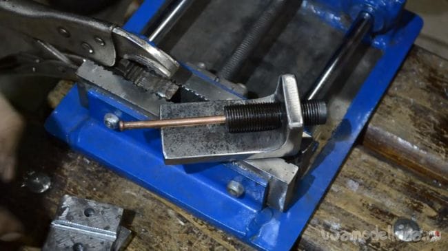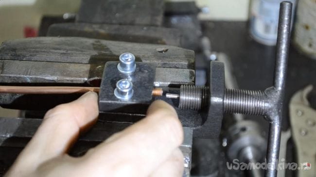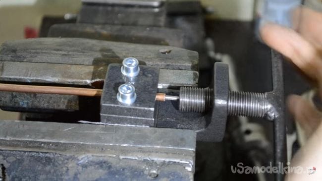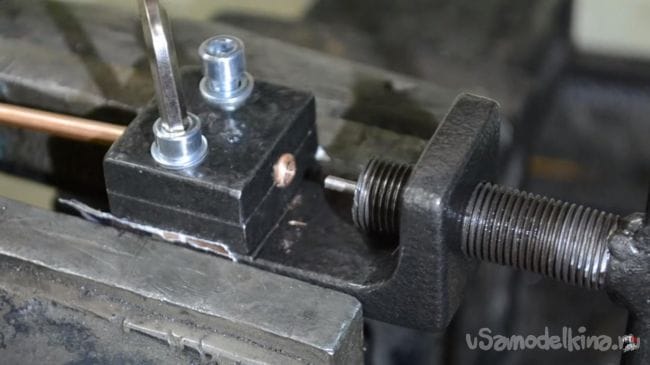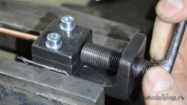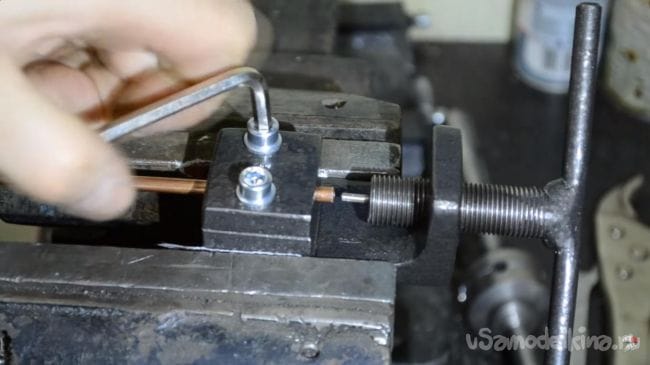 Зажимаем инструмент в тисках, берем медную трубку диаметром 5 мм и просовываем в паз, оставляя примерно 5 мм снаружи, затем затягиваем болты шестигранником.