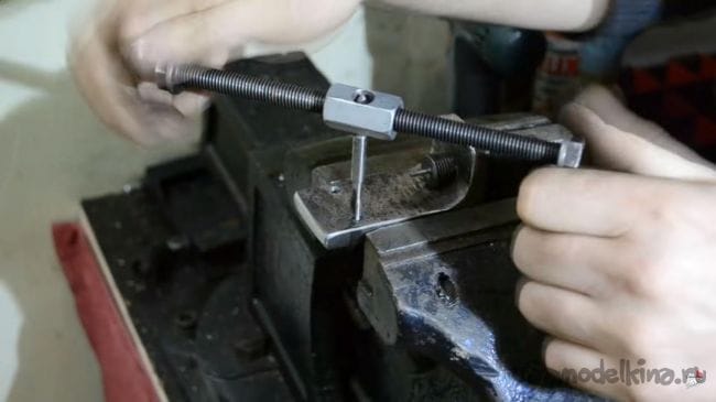 Далее вращаем болт с штырем до упора в крепление трубки, после чего ослабляем натяжение болта и откручиваем обратно, крепежные болты тоже ослабляем и вытаскиваем трубку с развальцованным кругом.