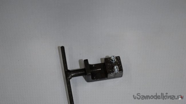 Берем тормозную трубку и одеваем на кончик болта, далее устанавливаем под нее заготовку с пазом под трубку, а затем фиксируем при помощи ручных тисков и начинаем намечать места сверления.
