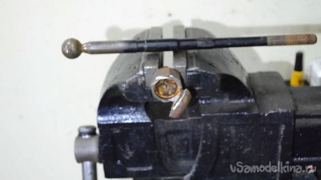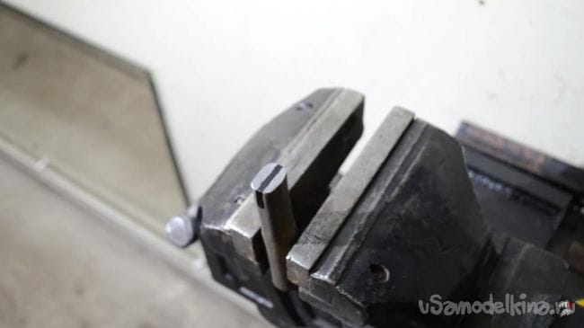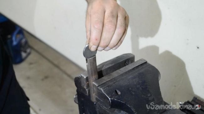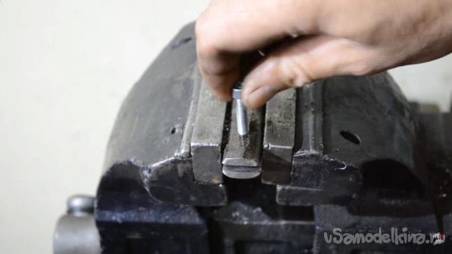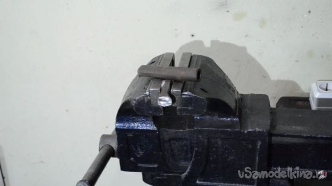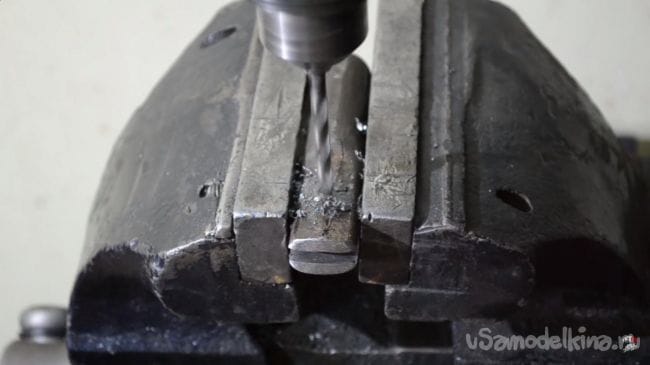 Затем фиксируем заготовку в тисках. Сверлим сквозное отверстие при помощи электродрели с установленным в ее патрон сверлом по металлу на 5 мм.