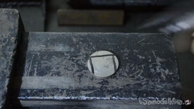 Для того, чтобы можно было зажать шайбу в детали, пропиливаем еще один паз, но поглубже. В итоге должно выглядеть так.