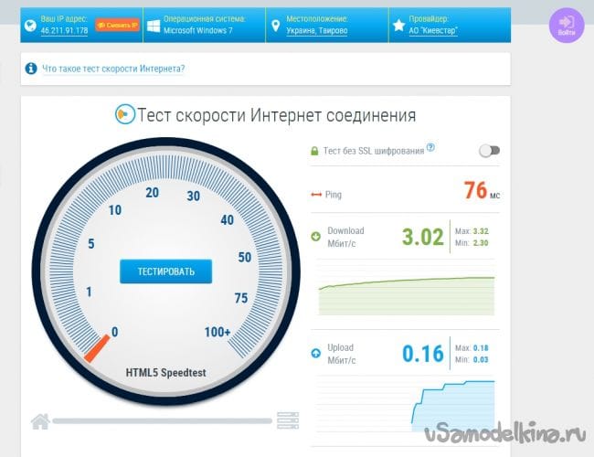 Пришло время тестировать, модем у меня имеет функцию роутера, то есть, раздает Wi-FI, и довольно далеко, по воздуху спокойно ловится на 150 метров. Поднял антенну над домом и развернул на вышку. Ранее тут ничего не ловилось, сейчас модем с легкостью увидел 3G-покрытие. Скорость у меня без труда идет в 3 Мбит/с, а раньше я сидел на убогом EDGE, который выдает не более 0.17 Мбит/с.