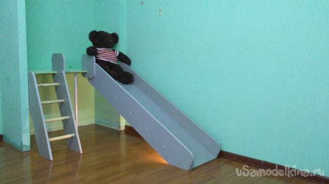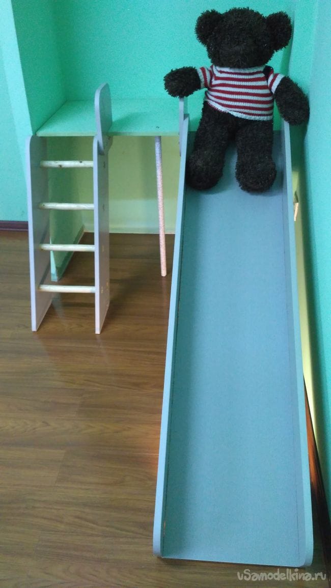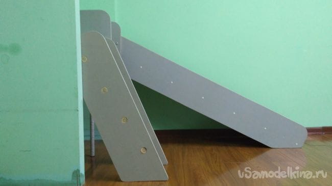 Теперь собираем всю конструкцию на месте, стираем все карандашные чертежи и пометки. Здесь важно ничего не забыть и не упустить. Я например когда прикручивал жёлоб горки, подставил под него тумбочку. Потом прикручивая лестницу тумбочка была не нужна, но вытащить я её не подумал. А когда весь монтаж был закончен оказалось что теперь тумбочку оттуда не вытащить. Пришлось откручивать лесенку, доставать тумбочку и прикручивать обратно.
