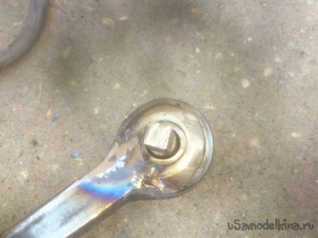Потом я вставил пруток в ключ, выровнял и отметил на другой стороне маркером размеры, по которым потом отрезал и обработал. Ведь переключение на реверс в моей "трещотке" не будет предусмотрено!))) Поэтому необходимо просто сделать два посадочных места подголовки с разных сторон. Одним будем отворачивать, другим - заворачивать...: