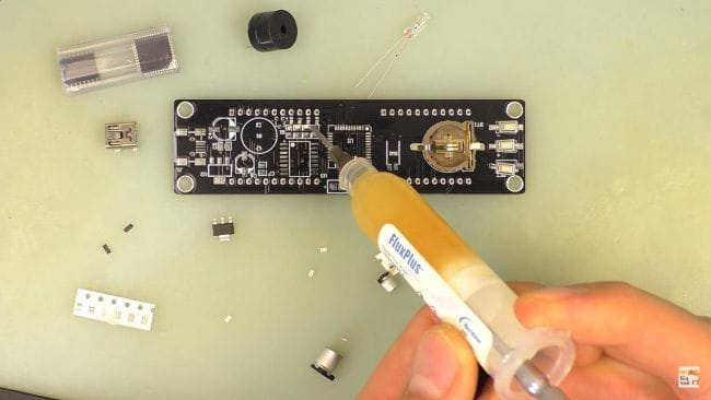 Сначала установим самые маленькие элементы на плату. Наносим флюс с шприца с одной стороны контактов, после чего укладываем на контактные площадки SMD-резисторы и припаиваем к залуженной площадке при помощи паяльника и припоя.