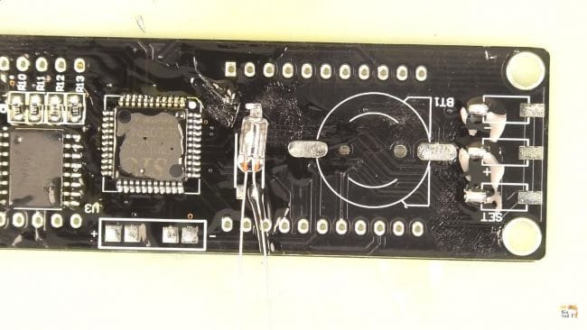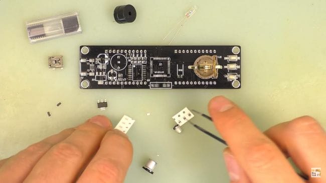Для того, чтобы часы могли работать также в роли будильника, вставляем на плату зуммер и припаиваем, он имеет полярность, плюсовым выводом является длинная ножка, а на плате плюс обозначен квадратной контактной площадкой.