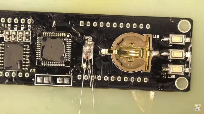 Далее припаиваем термодатчик, а затем три кнопки, придерживая пинцетом для удобства. После установки кнопок, на плату устанавливаем гнездо для батарейки, она в данном случае служит для сохранения всех настроек и времени при отключении от питания.