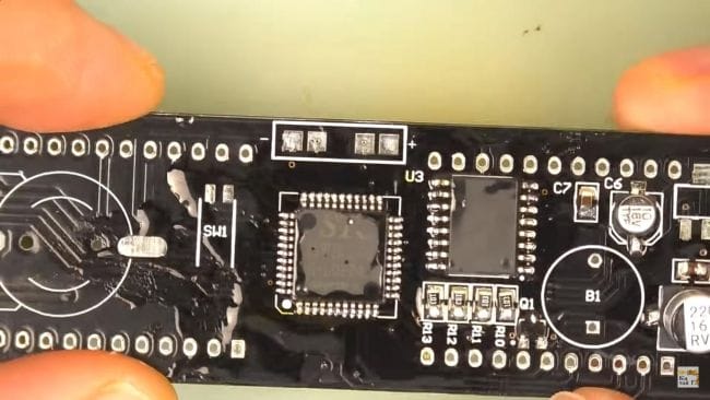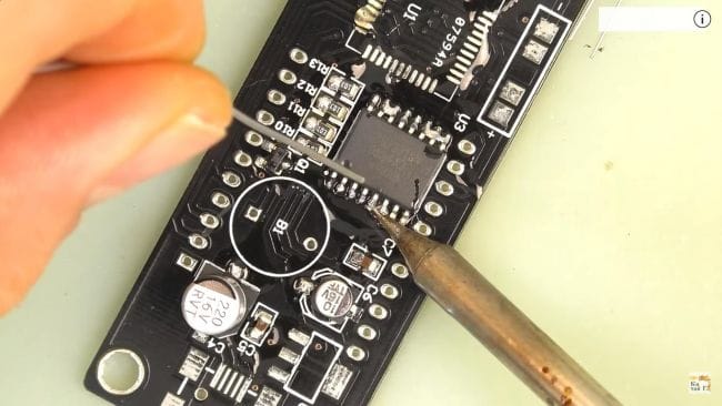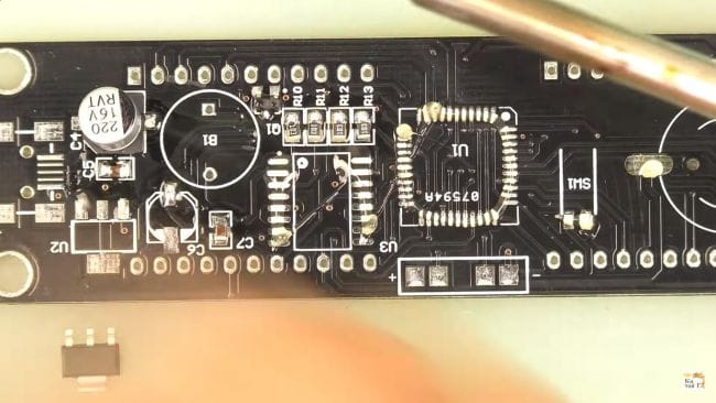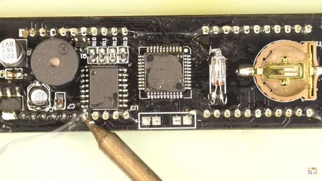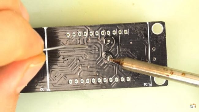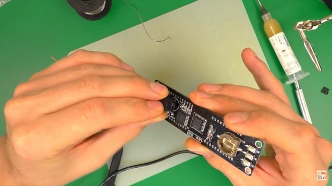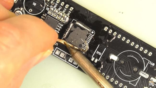Теперь наносим флюс на контактные площадки под установку микросхем и припаиваем их при помощи паяльника и припоя. Микросхему нужно расположить так, чтобы ее ключ в виде точки на корпусе совпадал с направлением белой точки на плате. При пайке выводов микросхем старайтесь не перегревать их, так как это может вывести их из стоя из-за большой температуры.