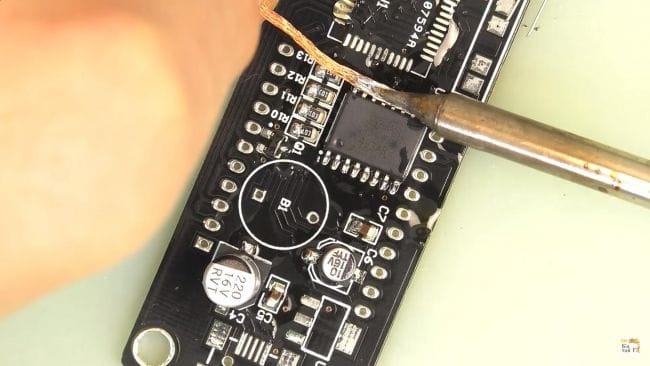 Если ножки микросхемы в процессе пайки спаялись друг с другом, то это можно исправить при помощи медной оплетки, которая впитывает в себя излишки припоя.