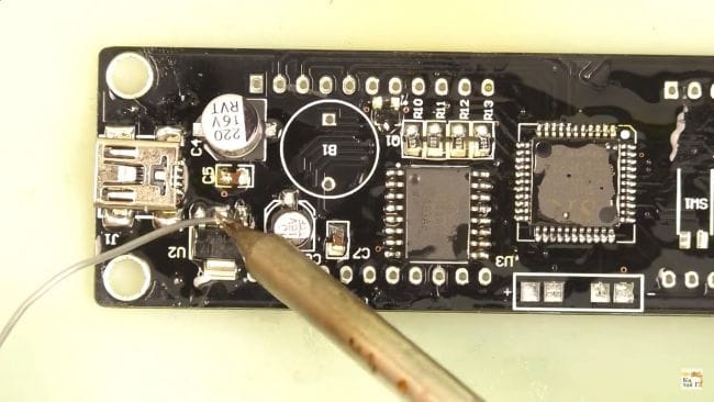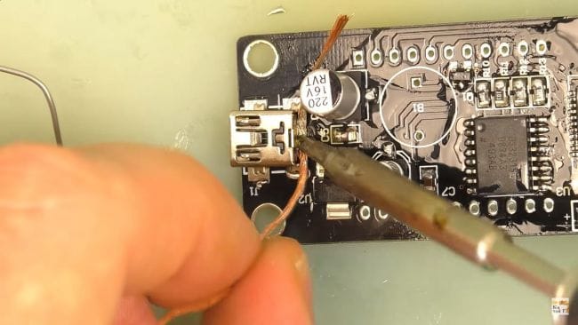 Для подключения питания припаиваем на плату Mini-USB штекер, его выводы находятся очень близко, поэтому при их спайке друг с другом также используем медную оплетку.