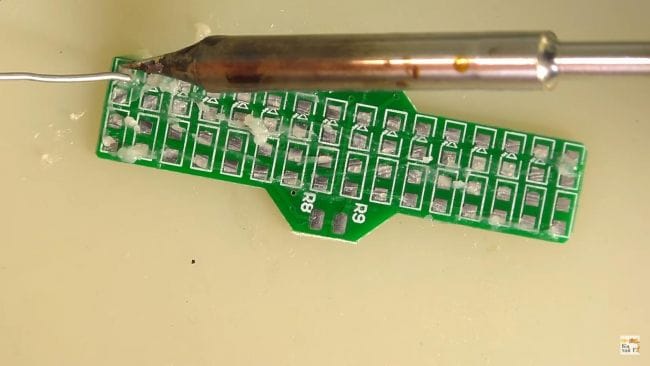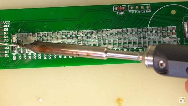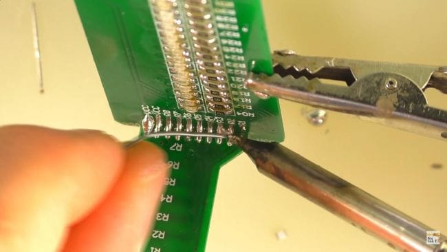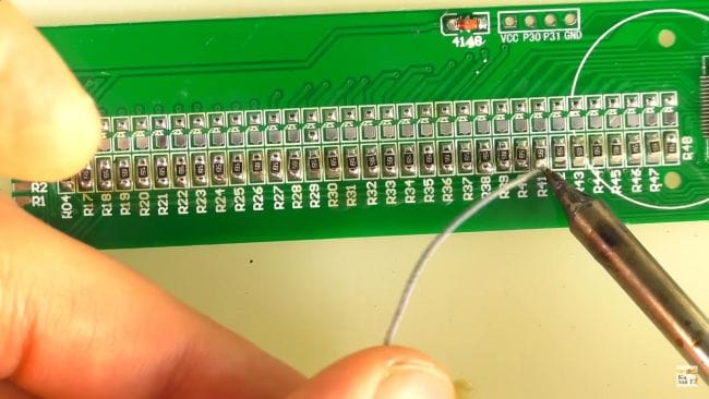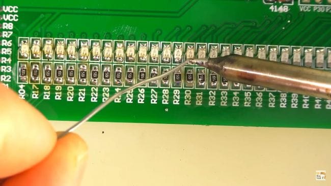 Далее, припаяв по одному контакту все резисторы, припаиваем их вторую сторону и при необходимости добавляем припой.
