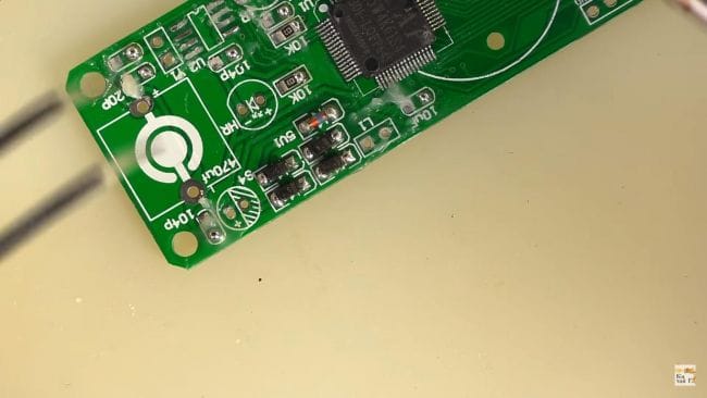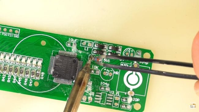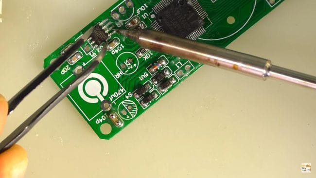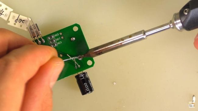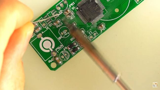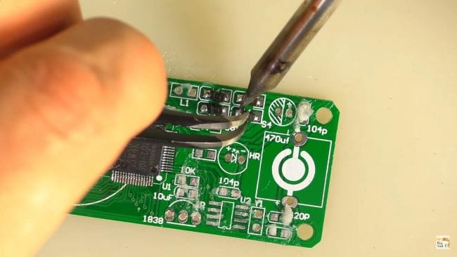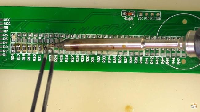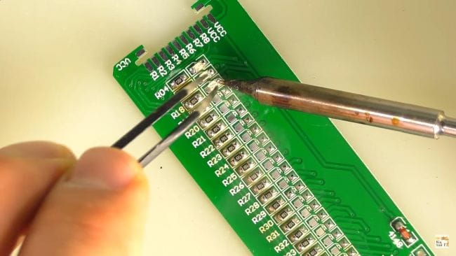После чего при помощи пинцета ставим резистор на свое место и припаиваем паяльником.