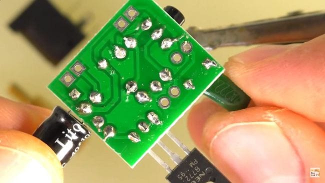 Микросхему устанавливаем на плату, ориентируясь по ключу на плате и на корпусе в виде точки. Ее выводы припаиваем по отдельности, чтобы не перегревать микросхему. Если выводы спаялись друг с другом, то лишний припой можно убрать при помощи медной оплеткой.