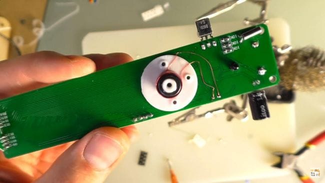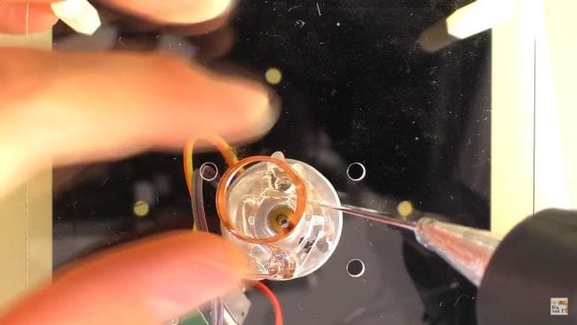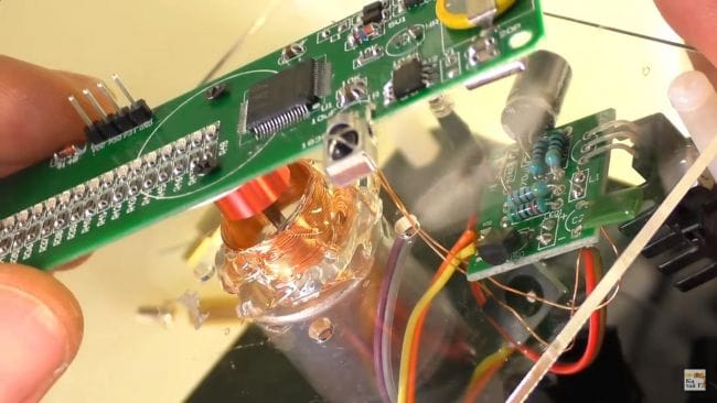 На верхнюю часть приклеиваем катушку при помощи термопистолета, ее нужно расположить строго посередине относительно вала моторчика, выводы от катушки припаиваем к плате питания, продев через отверстие. При установке катушки оставляем небольшое расстояние между крепежными винтами моторчика, чтобы контур не замкнул.