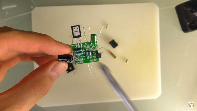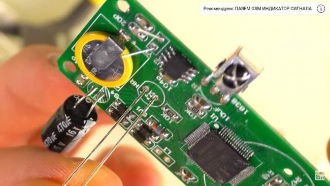 Теперь на плату устанавливаем приемник, батарейку. Также вставляем конденсатор на 470 микрофарад, соблюдая полярность, плюс это длинная ножка, минус - короткая, на плате минусовой контакт обозначен штриховкой.
