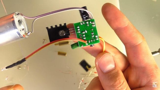 К другим проводам припаиваем электромоторчик и прикручиваем его на ту же панель из оргстекла двумя винтиками. Для подключения питания предусмотрено гнездо, которое нужно подсоединить через провода к плате.
