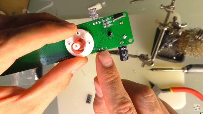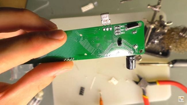 Светодиод на данном этапе не впаиваем, так как он будет крепится на корпусе и соединяться с платой через провода. С обратной стороны платы загибаем выводы деталей, чтобы при пайке они не выпали и закрепив плату в приспособлении "третья рука" припаиваем ножки к контактам. После чего удаляем остатки выводов бокорезами.