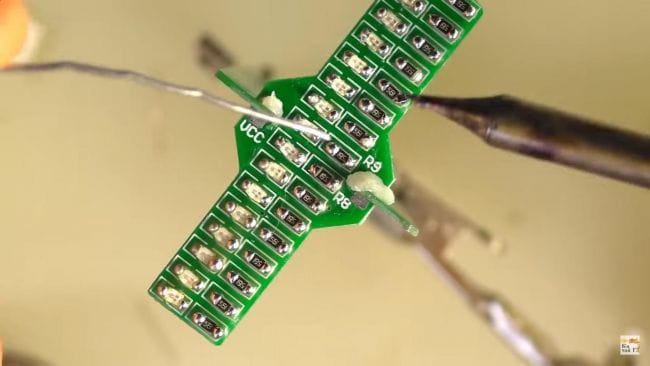 Переходим к сборке маленькой платы, на нее наносим флюс и аналогично предыдущей плате припаиваем светодиоды и резисторы.